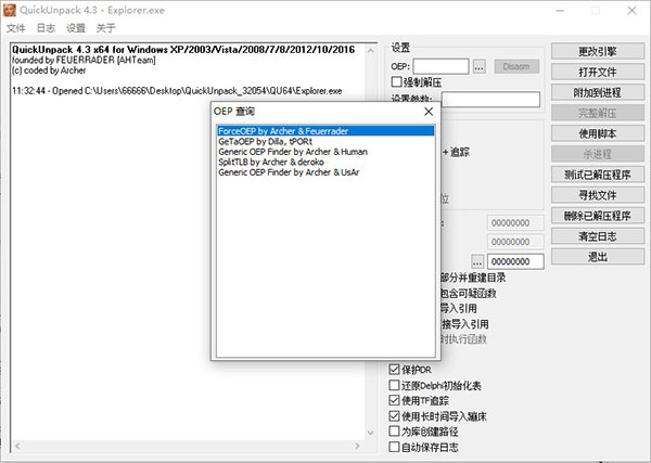 6、现在 Quick Unpack 使用新的模块(Force.dll)能侦测到大部分流行壳的 OEP,目前支持的类型有 UPX 1.xx, ASPack 2.12,FSG 1.0/1.33/2.0,MEW10,MEW11,PECompact 1.x/2.x‘。
