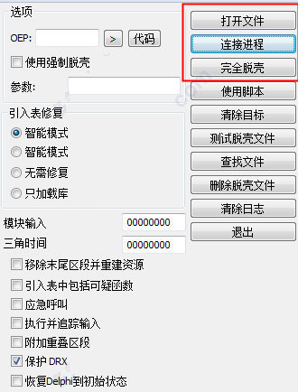 2、Quick Unpack能够支持连接进程、完全脱壳、使用脚本、清除目标、测试脱壳文件、使用PEID扫描以及删除脱壳文件等功能!