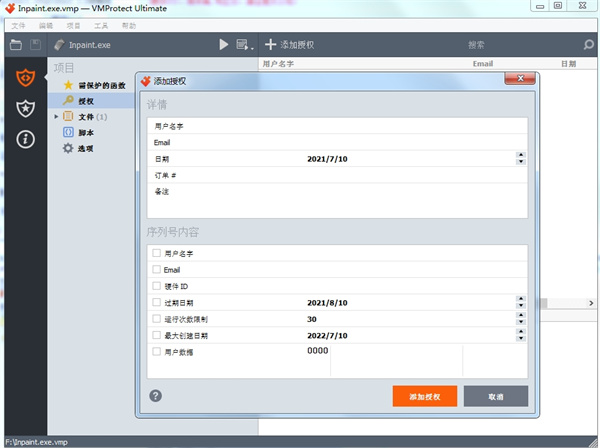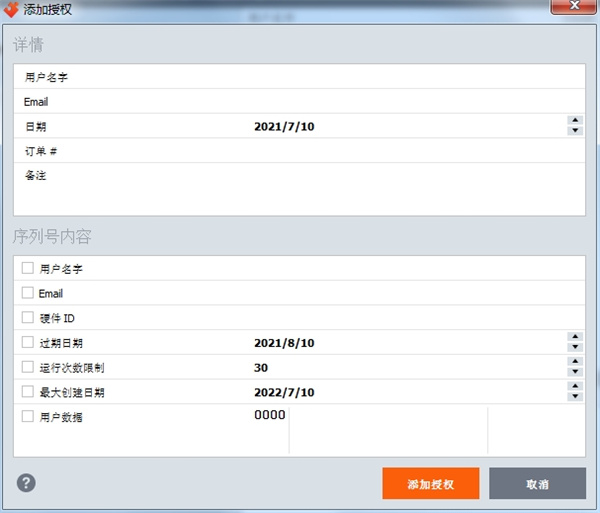 授权功能帮助用户限制免费更新周期、设置序列号的有效时间、防范在未输入序列号的情况下执行代码,并提供大量其他功能。还可阻止任何序列号,新的受到保护的文件不会接受此序列号。