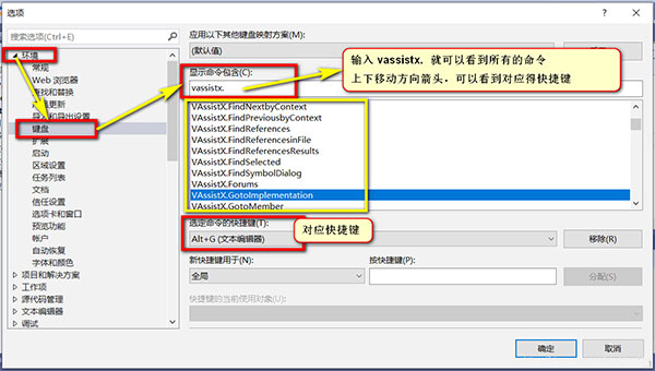 2、在 "显示命令包含:" 中输入 "vassistx." 就可以看到所有可以设置的快捷键了 ;