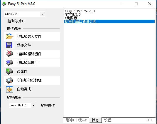 程序启动后,会自动检测硬件及连接,状态框中显示“就绪”字样,表示编程器连接和设置均正常。否则请检查硬件连接和端口设置。把单片机芯片正确地放到编程器的相应插座上,注意,芯片的缺口要朝向插座的把手方向。