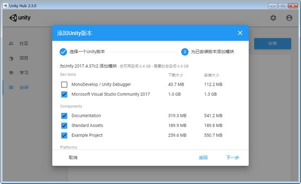 5、支持模块添加功能,为Unity软件配置附加的游戏设计模块。