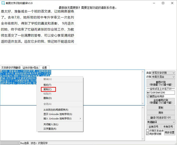2、截图所翻译的内容在中间显示,可以一键复制