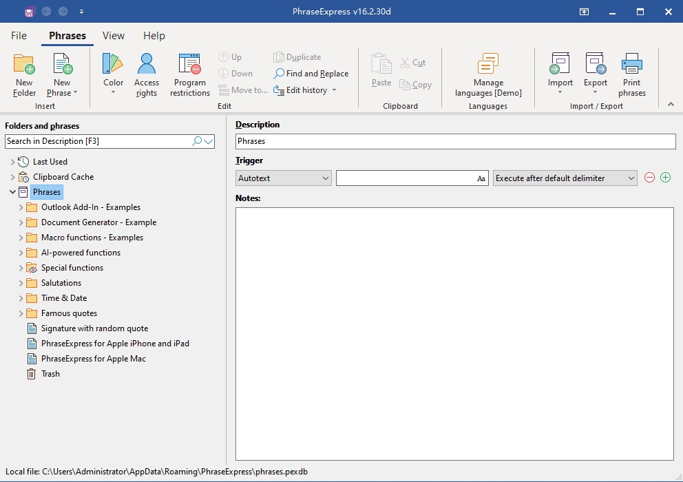 PhraseExpress是一款短语快速记录工具,它可以完美替代电脑的复制粘贴工具,并且其功能也是相当的方法,诸如文字缩录、热键启动、剪贴板增强、超级宏等等操作!同时,软件还具备着创建各种格式的短语/片语、纯文本、RTF短语、HTML短语、Word短语,通过快捷方式快速输入以提高工作效率。此外,PhraseExpress短语快速记录工具还提供了强大的宏功能,可以将动态文本添加到短语中,且还能进行添加当前的日期、时间或计数变量等、启动应用程序、文件或打开的程序等操作。有需要的用户欢迎下载使用。