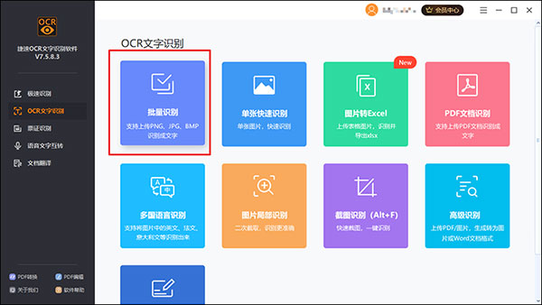 在电脑中打开捷速jpg转换成word转换器,作为我们进行图片转文字的工具。然后,在首页的众多识别功能中,我们找到批量识别图片功能,开始准备识别图片。