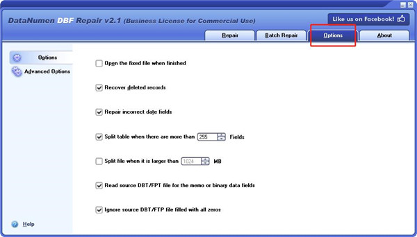 7、软件的设置界面:完成后打开固定文件、恢复已删除的记录、修复错误的日期字段、超过255个字段时拆分表格、大于1024时分割文件