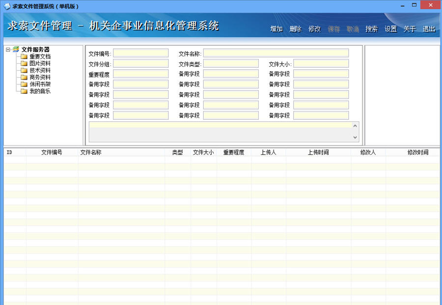 求索文件管理系统采用先进的分布式数据库存储技术,支持任意格式任意大小的电子信息文件的集中管理,是机关企事业单位文档管理,信息化建设的首选产品。广泛适用于各行业海量的办公文件管理、设计图纸管理、机密文档管理、私密照片管理、音像资料管理、媒体资源管理功能