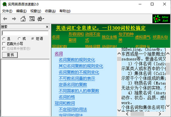 这款实用英语语法速查软件真的太棒了,简直就是我这种英语学习者的福音!它完全免费、无广告还无需安装,下载解压就能用,简直不要太方便。我最喜欢它的自定义搜索功能,哪里不会查哪里,还能把重点收藏起来反复看,比翻厚厚的语法书高效多了。软件里包含了成千上万种基础语法,功能全面又实用,对于日常学习和查询来说绝对是神器级别的存在。虽然界面还有提升空间,但v2.0版本已经优化了不少,而且修复了语法重复的bug,体验越来越好了。真心推荐给所有正在学英语的小伙伴,有了它,语法学习真的能轻松一大截! 功能特色 1、功能全面,深受用户喜爱。 2、可以自主的查询英语语法是否使用错误。 3、内含了成千上万种基础的英语语法。 4、可以自定义的搜索与查找。 5、一键收藏功能。 使用说明 1、无需安装,解压打开软件。 2、点击查询按钮。 3、输入相关的英语语法或者相关的单词。 4、语法显示在界面中。 5、点击文件,然后选择退出按钮。 更新日志 v2.0版本 1、优化了用户界面。 2、其他功能更加的完善。 3、修复了语法重复的bug。
