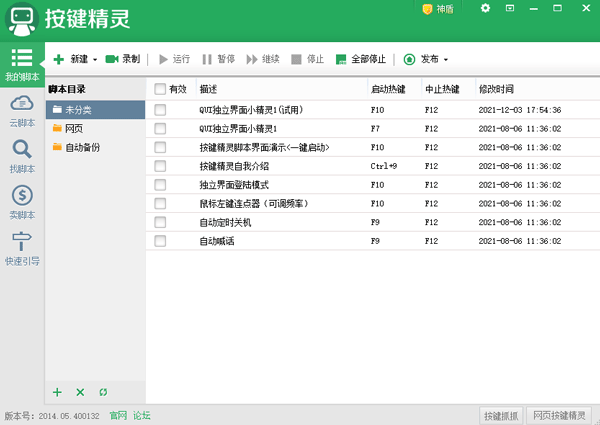 1、您可以新建或录制脚本,哪怕不懂代码也能直接点击使用脚本精灵里的命令来制作脚本或是直接使用录制功能录制键鼠的轨迹和使用,没有专业基础也能学会。选择勾选有效的脚本,通过设置热键,您可以随时一键运行和停止脚本,省心省力。