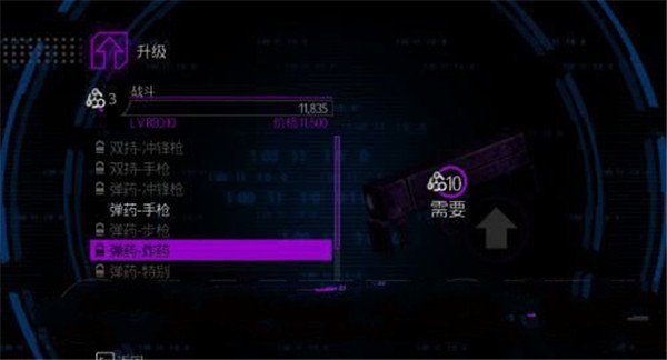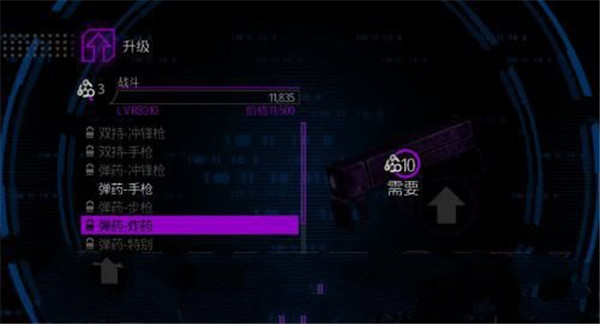 这里的战斗指的是在战斗中的能力提升,里面包括“双持”、“弹药”、“武器”、“近战”三种,其中双持可以增加攻击效率、攻击力增加一倍;弹药可以提高子弹的携带量;“武器”是可以升级武器库中的装备,在武器库的通道里,可以新的武器。