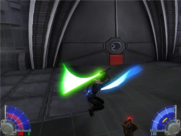 绕到旁边找到秘密地点,然后跳到“车厢”顶部,前进到连接部。进入舱内关闭电流,出去继续前进,经过多节“车厢”,从右侧进入舱内,搭升降台到上层,按下开关,掷剑摧毁两侧的电子仪表关闭货舱的防护屏障,进去借助箱子跳到顶上,前进,在一个“车厢”内排除炸弹后,前进至空中列车的头部,进入驾驶舱停下列车,过关。沿路前进,注意用Protect防止受酸雨侵害。一路杀至河边,过桥,沿著河岸走,来到一栋建筑旁,这里有两艘飞艇,无法通行。先进屋,一路前进。在一道门前,等待(同伴)去开这道门的时候,一个黑武士出现,将他解决后门开了,出去控制机枪解决飞艇,然后原路回到楼下,继续前进,来到城堡门前,进入小门,过关。在开始的仓库,跳到高处的平台上是秘密地点。然后钻进旁边的管道,在石块压过来之前跳出坑去,穿过另一条通道来到控制室,出去来到走廊上,右边一道门还打不开。转过拐角到尽头可以Pull开一个箱子,爬进秘密地点。继续前进会碰到三个杰迪,前面的路会通回到坑边。可回到刚才的门边,Kyle会打开门。动画过后,Push启动几个红色抽水泵抽干水,沿管子上去,一路前进,最后来到设备的高处,Pull几个反射板让它们把能量射回设备造成超载而爆炸,过关。来到上层,一路往前杀,会碰到许多难缠的对手,甚至有持双剑和光杖的,最后杀到一个厅上,发现Rosh成了敌人的手下。击败他们后过关。之后可选择新的光剑,可选双剑或光杖了。