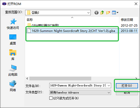 3、选择文件内的游戏gba文件打开。