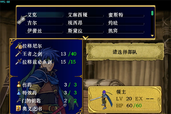 这关是与敌人主力的正面对决,敌军数量空前,而我方可出击的人数也是本作之最,尽谴精英出场吧。先全力消灭中间最接近的敌人,然后就可以集中对付右上杀下来的骑兵队。在全灭右边和左下的敌人后,再全军向左上的据点进军,据点右边拿スリープ杖的司祭要特别小心,优先解决他。那一带会出现多批援军,不可大意。BOSS使吸血魔法剑,用魔防高的对付他。