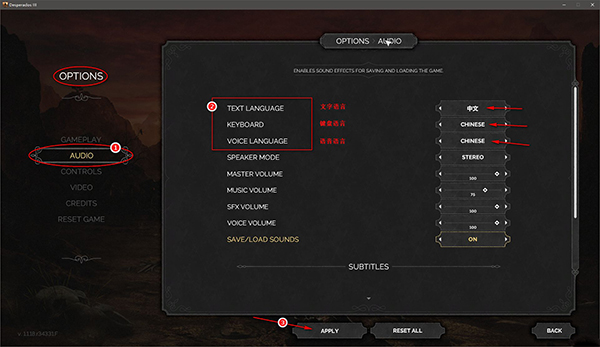 4、依次选择audio、text language、中文,点击下方的apply,就可以把游戏设置成中文了;