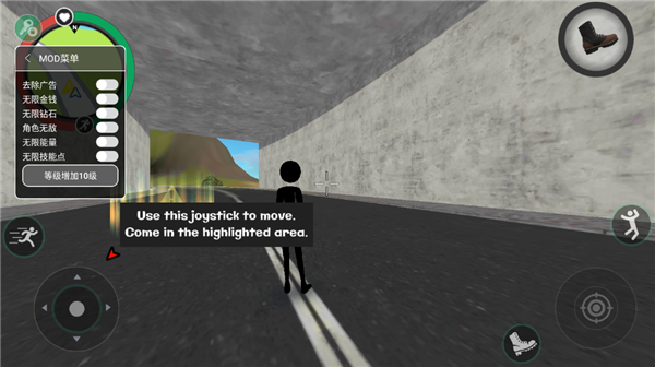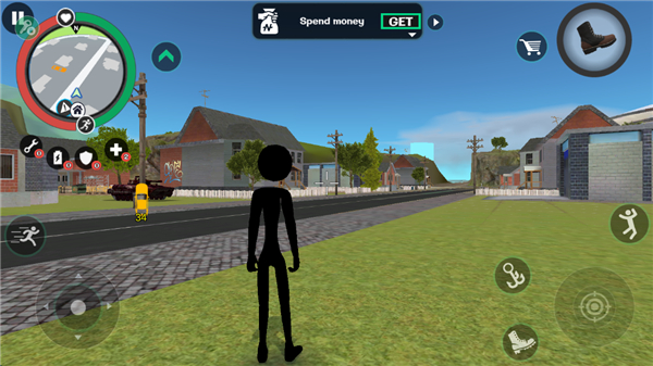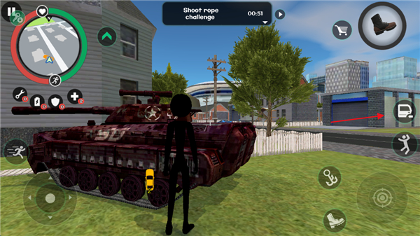 操作十分简单,玩家只需通过屏幕上的虚拟按钮,操控火柴人进行移动,跳跃,奔跑等动作,最有趣的就是钩锁技能,通过它玩家可以让火柴人像蜘蛛侠一样飞檐走壁,轻松抵达任何想去的地方。