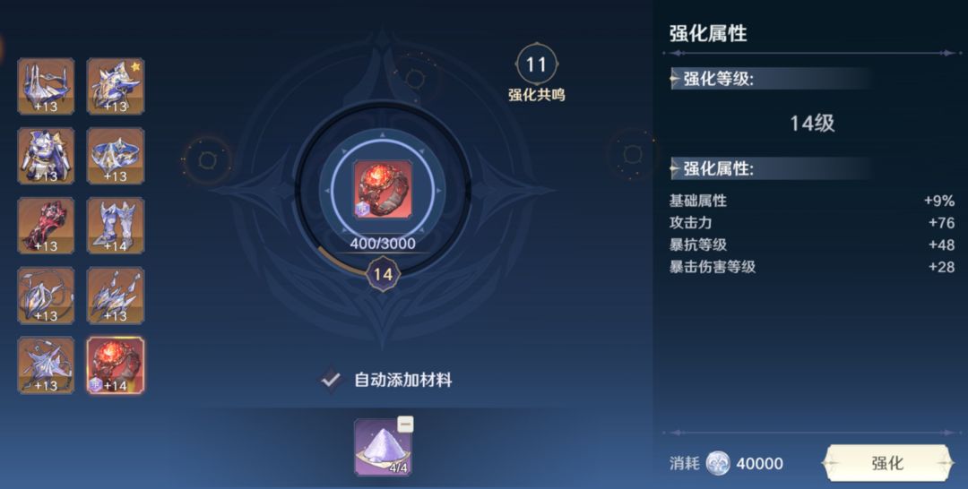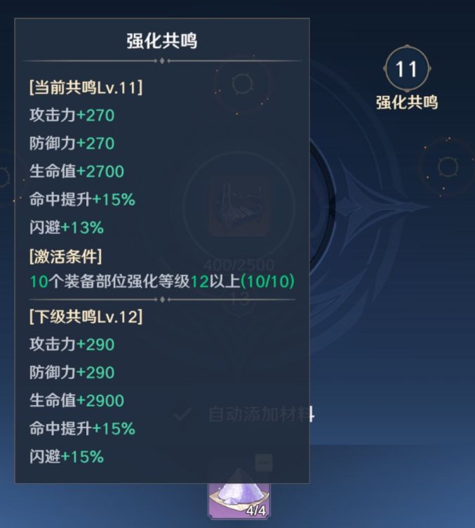 而强化则是字面意义上的强化装备,提高属性。其中值得注意的是【强化共鸣】,这个共鸣条件要求全体装备都达到指定等级才能激活,因此相较于只强化一个部位的顾此失彼,面面俱到地全体强化更为划算哦!