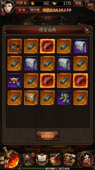 2、寻宝1次需要花费50元宝,而花费468元宝可以直接寻宝10次。寻宝可以获得传奇神甲、传奇神兵、麻痹戒指等极品装备,即使是平民玩家也不要错过每天1次的免费寻宝哦。