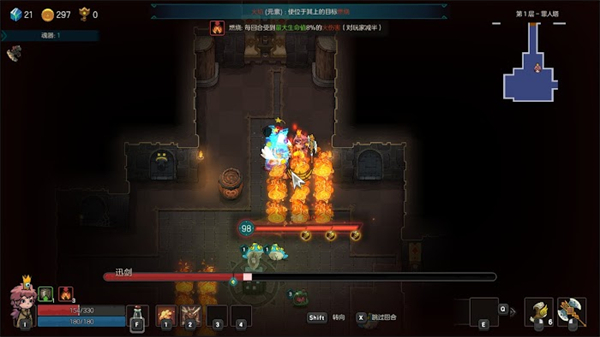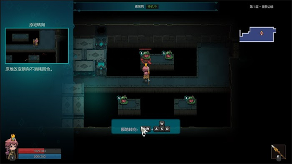 然后前面就是攻击的教程,按shift+wsad就可以转换方向,鼠标对准敌人来攻击,小心不要掉入深渊,攻击一定要点击怪物,不然是无法攻击的,把这4个怪物打死就可以前往下一个地图。 这里就就不多说了