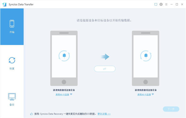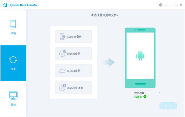 在主界面中选择恢复并且连接手机到电脑,然后,在恢复界面选择Syncios备份,在弹出的窗口中选择想要恢复的备份,点击下一步进入数据选取界面,选择需要的数据并进行数据传输