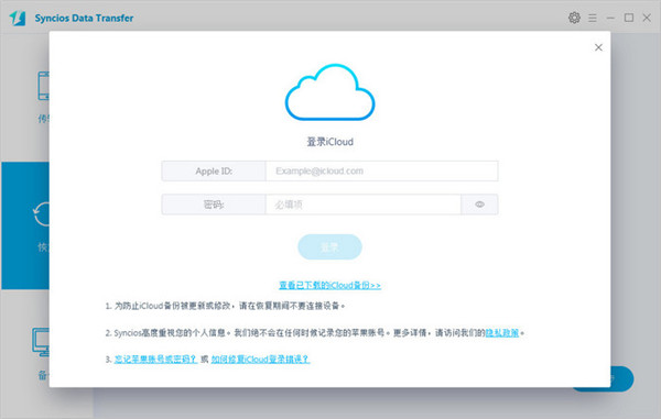 在主界面中选择恢复并且连接手机到电脑,然后,在恢复界面选择iCloud备份,在弹出的窗口中登录您的iCloud账号, 选择想要恢复的备份,选取需要恢复的数据并点击下载,点击下一步进入数据选取界面,选择需要的数据并进行数据传输