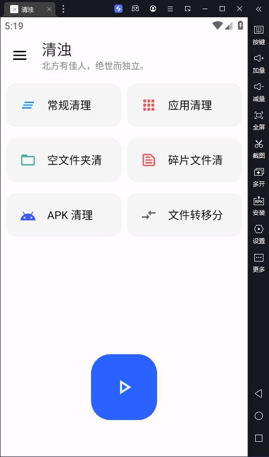 清浊电脑版是借助安卓模拟器运行在pc端的一款手机清理工具。它提供了一系列强大的功能,包括常规清理、应用清理、空文件夹清理、碎片文件清理、APK清理和文件转移分类等。大家只需要点击下方的蓝色按钮,软件即可自动分析和扫描本地文件,同样适用于安卓模拟器。总之,清浊让您不再担心存储空间不足,不再忍受应用运行缓慢,手机清理工具将成为你的超能力。