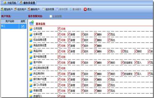 可以设置每个员工的菜单操作权、单据操作权、操作权及其他操作权限{比如:查看成本权(即能不能看到进价及毛利)、售价调整权(即能不能在销售时修改售价及折扣)等}。