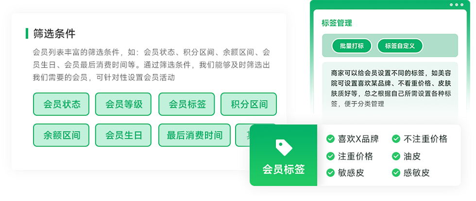 1、会员营销全方面短信、微信营销,节假日、会员生日一键多发,让您的优惠活动信息随时到达您的客户。设置不同类型的优惠活动比如“消费满1000减30”、“充值5000赠送2000”等活动,带动客户消费积极性。会员积分可以兑换不同类型的小礼品。