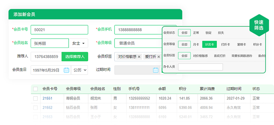 全方面帮您管理会员,助您会员越来越多!拥有不同类型和功能的卡片,可设置计次卡、打折卡、储值卡、积分卡、月卡季卡;支持会员推荐、员工开卡提成、根据自定义属性记录不同的会员资料;可进行会员充次、充值等。