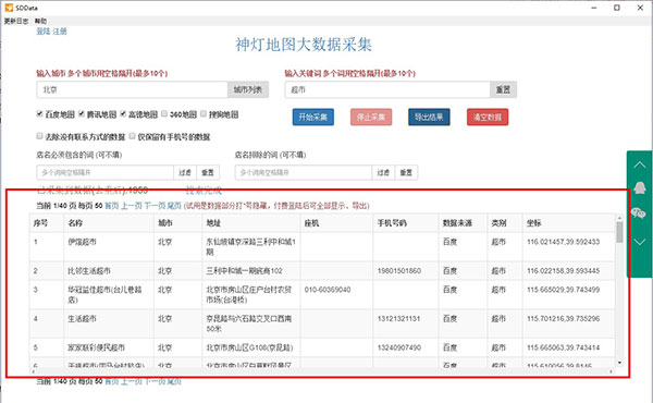 5、采集数据会出现在软件下方。可以看见名称、城市、地址等信息。