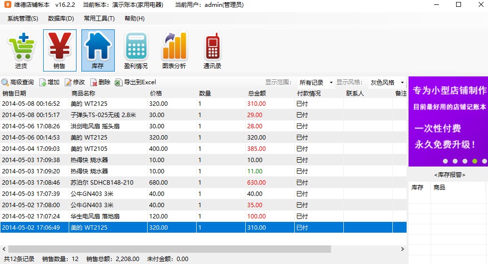 维德店铺账本是一款适合零售小店铺记帐软件。绿色版无需安装,功能简单、实用!只需要您动动鼠标,敲几个数字就可以轻松完成账务的录入、查询和统计。适用于有进销存需求的小店铺(如烟酒店、五金店、手机店等)记帐。