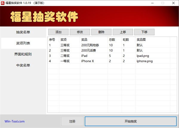 在奖项列表中维护所有奖项信息。抽奖顺序为从上到下,即序号为1的奖项最先抽取,可以通过上移或下移按钮来调整奖项的顺序。