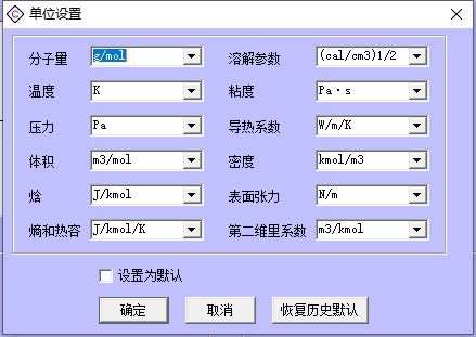 4、“设置”菜单中有“单位设置”和“界面设置”两个,其中“单位设置”可设置各个物性参数的单位,“界面设置”可以更改主界面的菜单栏颜色、状态栏颜色和所有窗体的控件颜色。