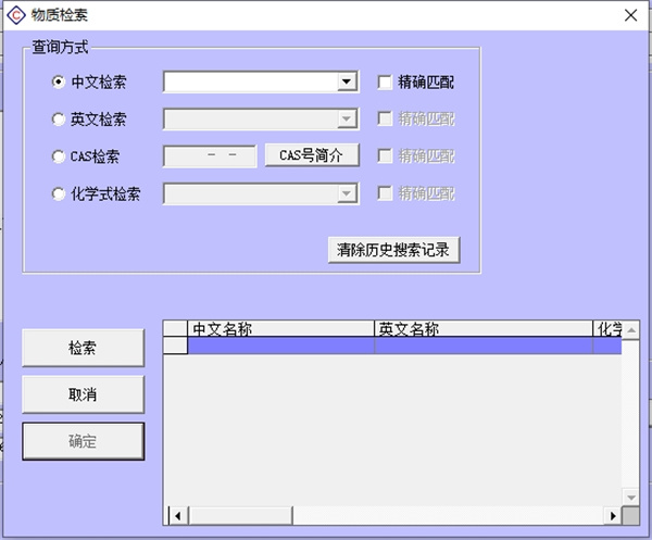 3、“查询”菜单是进行物性查询的界面,查询方式有“中文检索”、“英文检索”、“CAS检索”和“化学式检索”,也可进入查询界面后再选择查询方式,除“CAS检索”查询方式外,其他查询方式均可以浏览历史查询记录,通过点击下拉菜单完成;