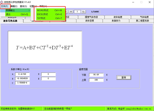3、本软件可查询近1700种化学物质,可查询其常规性质,也可查询多种随温度变化的参数,如液体导热系数、饱和蒸气压、气化焓、液体热容、液体密度、理想气体热容、表面张力、液体粘度、气体粘度和第二维里系数。