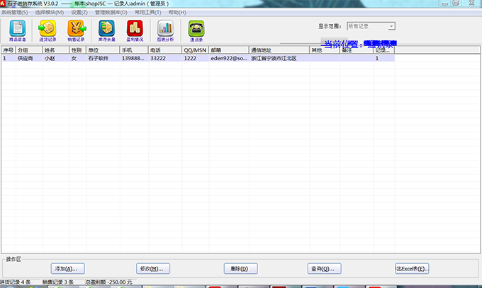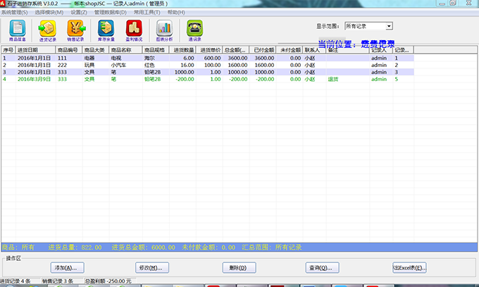 2、可以对进货记录进行“添加”、“修改”、“删除”、“查询”、“导出Excel表”等操作。