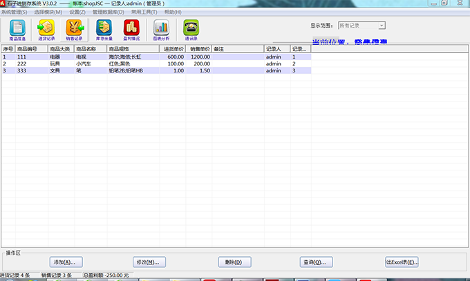 2、只有有“进货记录”的商品才能在销售记录中添加。