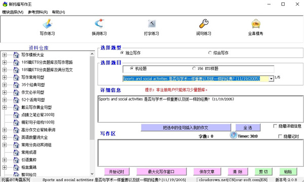 写作能力的提高过程就是不断集众家之所长,不断吸收消化佳文妙句的过程。本模块提供了超全的必备精彩写作资料:综合写作独立写作模板大全、ETS分类题库、写作思路及几百篇满分范文、写作经典句型、必杀句型、活用句型、黄金句型、精彩句子结构、必背转承词、数量词大全、常用动宾词组、常用成语、引语集粹、格式集锦、警句拾贝、谚语精选、增色佳句、报刊佳句、新东方范文50篇、写作万能理由等。还提供了全部机经题、ETS样题