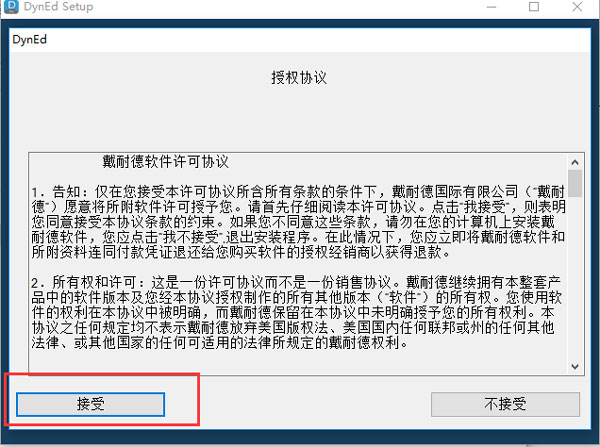 四、进行授权协议的查看,这里主要是告知用户在使用该程序需要遵守的法律和相关限制,同时提醒用户该程序的所有权归DynEd International公司,且不得用于商业行为等内容。用户详细浏览完成之后,点击“接受”