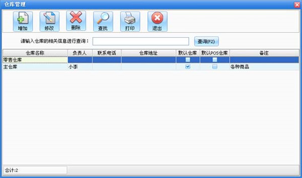 在系统设置模块中点击“仓库设置”按钮打开仓库设置窗口如图所示。在窗口中可以看到所有的仓库。点击“增加”按钮打开增加仓库窗口,输入仓库的信息,仓库名称不能重复。