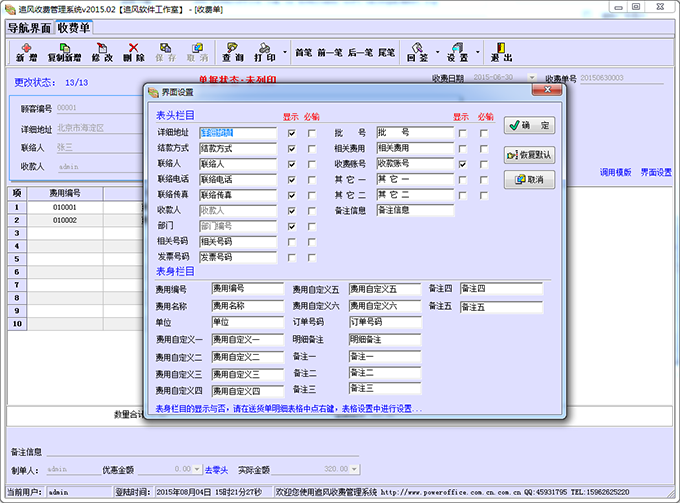 在收费单管理界面,不仅提供了收费单的增、删,改、查,同时也可以对栏目、界面及其操作习惯进行设置