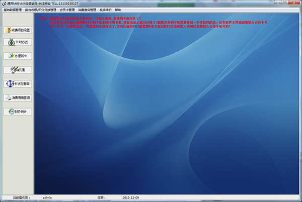 3、系统维护新增操作员,操作员授权管理,会员卡解密查询,员工录入,服务项目设置,消费品提成设置,退卡管理,退卡查询。导出Excel功能,改进了授权管理功能