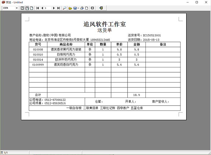 系统中每种单据都可以依自身管理要求设置打印格式。同时也可以依据公司要求对一种业务单据设置多种输出打印格式