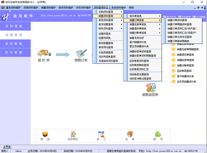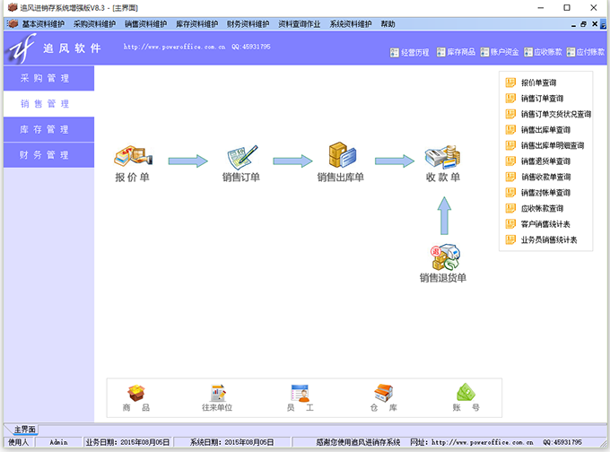 在销售管理的部分,系统中提供了从报价、订单、出货退货到收款的全面管理,单据间即可以自动沟暨转换