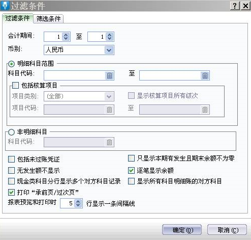 参见<凭证查询>过滤条件。如果确定了筛选条件,则在明细账打印时,打印输出的内容与筛选的内容完全一致。