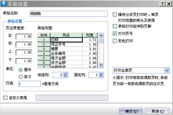 明细分类账的打印输出格式您可以自行设定,明细分类账中各栏目的宽度值,以及页边界设置等。在查看菜单中选择“页面设置”选项,系统即弹出页面设置窗口。在此窗口中您可以设置明细账打印输出时的各栏宽度,页边界宽度,表头,表尾输出的形式,以及是否打印页号。