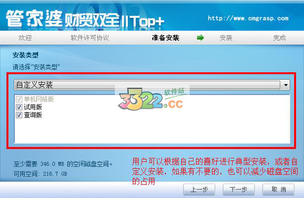 接下来就是安装路径的选择了,我们的安装程序已经将软件安装路径选择到了D盘,而且软件还是有点大的占了346MB的存储空间,直接点击下一步就是我们的安装类型选择,用户根据自己的喜好选择安装的内容。