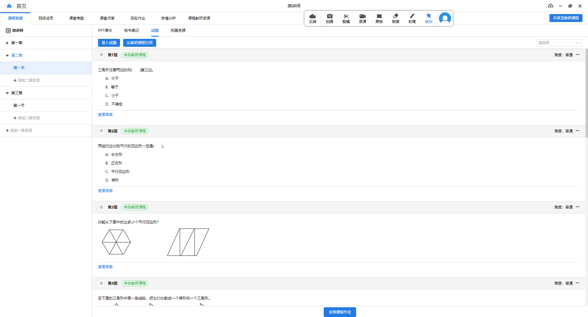 2、课程题库:批量录入智能识别,海量题库在线引用,线上线下灵活组卷,一键打印纸质试卷。