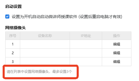 支持,软件工具条 —> “更多”—>“软件设置”中的“网络摄像头”栏目可以设置摄像头连接,最多可接入3路摄像头同时录制,但要求讲台和摄像头在同一个局域网,且知道监控摄像头的账号密码。