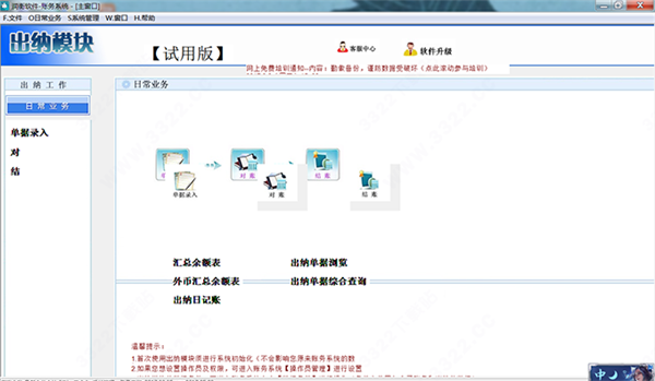 便捷式单据录入操作,流水账增删改自如;与财务模块的数据互通,可相互读取,工作效率高;快速与财务账进行对账,实现资金管理透明化、准确化;随时可查看各出纳科目的余额数;随时可调出查看、打印流水账,操作简单,一目了然。