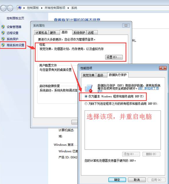 方法一:找到【计算机】,右键,打开属性,进入后,单击【高级系统设置】,进入【高级】页签中,点击【性能】下的【设置】按钮,找到【数据执行保护】页签,选中“仅为基本windows程序和服务启用DEP”确定,重启电脑。